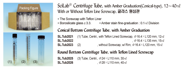 SciLab® Centrifuge Tube, with Amber Graduation(Conical-type), 12~40㎖With or Without Teflon Line Screwcap, 글라스 원심관